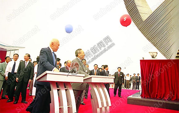 △6月8日,李嵐清和李光耀共同為園區(qū)湖濱大道 “圓融”雕塑揭幕。