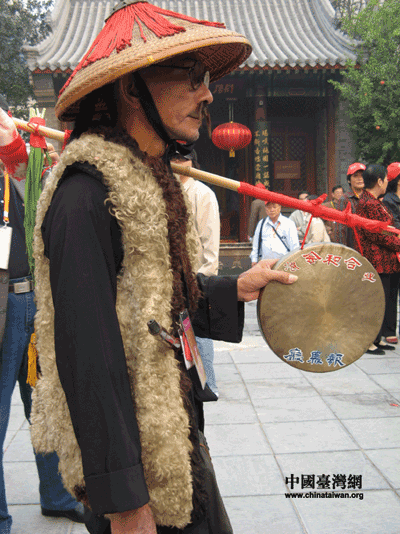 中國臺灣網(wǎng)10月4日消息 在第四屆天津媽祖文化旅游節(jié)的活動上,有這樣一個人因為裝扮的怪異而滑稽受到眾人關(guān)注,這就是臺灣媽祖“巡游”隊伍中走在最前端的報馬仔。