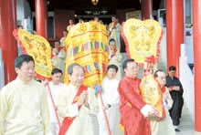 媽祖靈身在8位師父進行誦經和灑凈儀式后,由主祭在其他陪祭和儀仗隊陪同下,移駕至主要祭拜處,供善信祭拜。