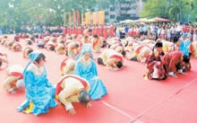 圖為祭祀者三跪九叩進(jìn)行祭天儀式。