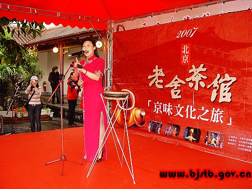 2007年1月2日至11日,由北京老舍茶館演出人員組成的,集京味文化、茶文化、戲曲文化于一身的第七屆“京味文化之旅”展演團(tuán),應(yīng)臺灣中華中道學(xué)會邀請來到寶島臺灣,先后在云林縣虎尾鎮(zhèn)布袋戲主題館、臺中耕讀園、臺北縣坪林茶葉博物館、臺北縣淡水紅樓茶館、臺北紫藤廬茶藝館和鶯歌鎮(zhèn)活動中心進(jìn)行了四場演出和兩場交流。老舍茶館獨(dú)具濃郁京味、京腔、京韻特色的展演,被譽(yù)為“茶與文化藝術(shù)的結(jié)合”,令島內(nèi)民眾看得如醉如癡,場場爆滿,受到了大批觀眾的喜愛。很多臺灣觀眾看完演出后意猶未盡,紛紛表示要到北京來看一個“原汁原味的老舍茶館”。