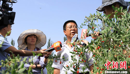 7月30日兩岸記者走進寧夏中衛市中寧縣萬畝枸杞園。圖為中寧縣枸杞辦公室負責人接受在枸杞園接受兩岸記者采訪。中新社發 石龍洪 攝