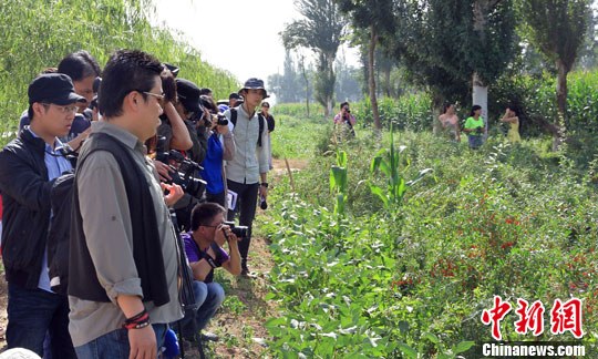 7月30日兩岸記者走進寧夏中衛市中寧縣萬畝枸杞園。圖為兩岸記者在枸杞園采訪。中新社發 石龍洪 攝
