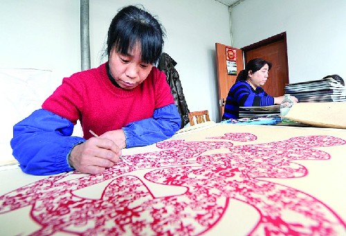 展廳里栩栩如生的花鳥魚蟲,生動活潑的戲曲人物,活靈活現的十二生肖,國色天香的牡丹圖、現代京劇《紅燈記》人物等剪紙圖案,無不展現了精細的刻工和濃郁的鄉土文化特色。“蔚縣剪紙最初的題材來源就是農村生活,無論是反映人們對吉祥幸福的企盼還是來源于勞動人民喜聞樂見的歷史故事、民間傳說及人物,無論是北方特有的文化背景和民俗風情的再現,還是用于四時節令、婚壽禮儀等慶典,都體現了民間藝人高超的智慧和豐富的想象力。”李新志說,蔚縣剪紙也是在發展中不斷變化的,由單一的色調發展為彩色,講究濃艷和諧,猛一看大紅大綠,仔細觀賞,各種著色冷暖搭配十分和諧、自然、悅目。