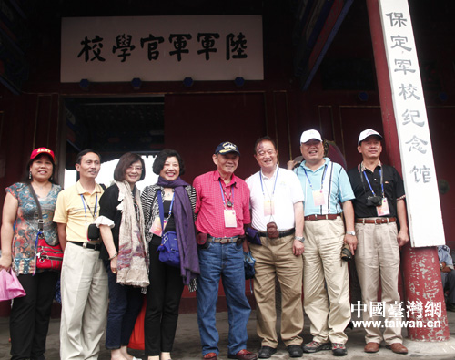臺灣嘉賓在保定陸軍軍官學校舊址前合影留念。右二為前臺軍上將、三椽畫塾指導顧問季麟連。(中國臺灣網 高斯斯 攝)
