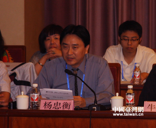 在7月9日上午舉行的“兩岸表演藝術傳承發展論壇”上,來自臺灣桃園縣廣藝基金會執行長楊忠衡就“兩岸表演藝術如何迎接市場挑戰”進行了演講。(中國臺灣網 蕪同 攝)