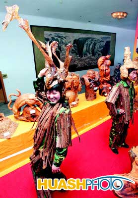 身穿樹皮衣,頭戴樹根帽,這可不是森林里的“泰山”,而是西洽會上的一幕。