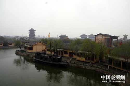 兩岸媒體參觀清明上河園,走過虹橋。(攝影 鐘寶華)