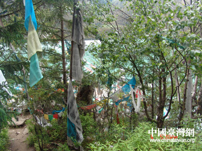 在巴松措湖,有一個水葬臺,水葬是藏民行葬禮的一種較低級別的儀式。在水葬臺旁邊有好多經幡,據說這個地方正是“圣湖的心臟”,藏民只要虔誠地祈福,然后把代表吉祥如意的哈達輕輕地放在湖面上,哈達就會沉入谷底,表示神靈接受了藏民的獻禮。