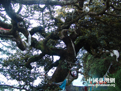 在巴松措湖島上,有個叫“錯宗寺”的小島,島內有顆大樹,形狀像是一個桃樹抱著一顆松樹,所以叫“桃抱松”。傳說這里是當年格薩爾王第一次征戰的地方。當地有個魚妖,興風作浪,格薩爾王施法術將魚妖制服,便把一個銀針釘在了魚妖的身上,由于佛教不殺生,所以,格薩爾王就開始教化魚妖,讓它修行。有一天,魚妖突然變成了一顆桃樹,而魚妖身上的銀針就變成了一顆松樹。這樣就形成了“桃抱松”的景象。