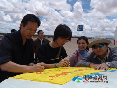 中國臺灣網(wǎng)7月13日格爾木消息 昨天,海峽兩岸記者青藏行聯(lián)合采訪團的記者采訪參觀了索南達杰保護站。記者們在采訪中,對藏羚羊等自然保護動物有了更深的認識,為了呼吁更多的人來關(guān)注和保護野生動物,兩岸記者用聯(lián)合簽名的方式,來表示對那些在艱苦條件下參與保護野生動物的志愿者的深深敬意,之后,兩岸記者把簽名的旗幟送給了索南達杰保護站的工作人員。(謝曉萍)