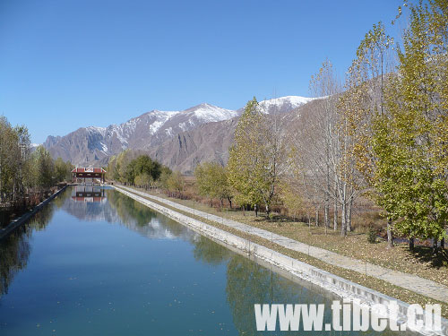 拉魯濕地水源水渠:碧水綠樹雪山。顧鈺攝