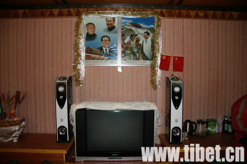 記者看到客廳的墻上掛著國家領導人的照片,問多布吉為什么掛的不是佛祖的像時,多布吉說:“解放時,我13歲,是個放牛娃,農奴,連鞋都沒有,光著腳。現在我家里每年收入一萬多,孫女兒在山南學跳舞,孫子在拉薩畫唐卡,我也沒啥力氣干活了,閑了就和村里的人擲骰子玩兒。今年,我還去拉薩看了奧運會火炬傳遞,真好看,高興著哪!這當然要感謝國家領導人。”
