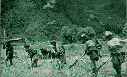 山南錯那地區(qū)落后使用木棍和鐵鋤翻耕土地