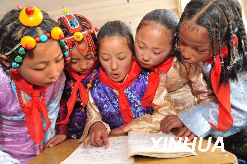 資料圖片:3月26日,昌都地區實驗小學學生嘎松曲西(中)與同學們一起念課文。新華社記者 何俊昌 攝