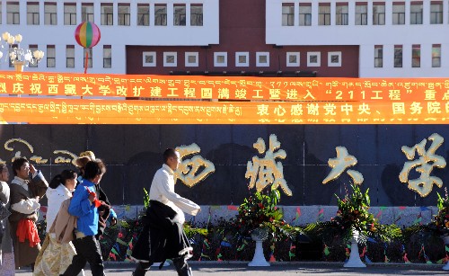 資料圖片:2008年12月16日,幾名西藏大學學生從新校區大門前走過。新華社記者 格桑達瓦 攝