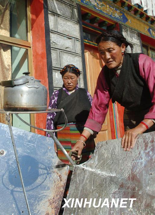 資料圖片:2007年12月11日,西藏江孜縣達孜鄉農民邊巴(右)正在用太陽灶燒水。 新華社記者 索朗羅布 攝