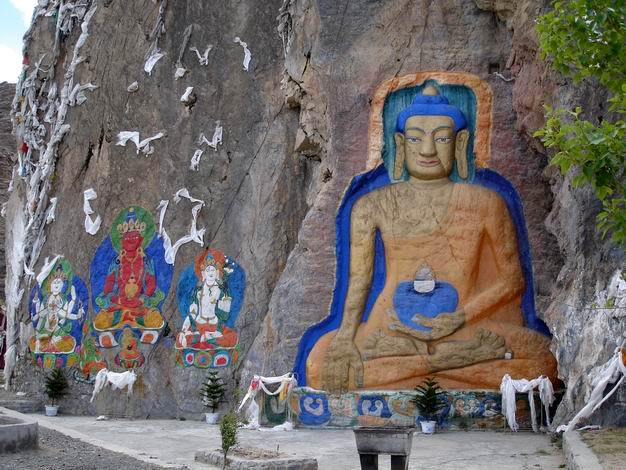 聶塘大佛是西藏最大的一尊摩崖造像。位于拉薩市西南40公里的聶塘山北麓,面向拉薩市,東臨拉薩河,拉澤公路魚貫而過。造像為釋迦牟尼佛在菩提樹下降魔成道的坐像,通高9.83米,寬7.9米,坐高1.3米,手長1.4米,腳長1.9米,系高浮雕,其造像洗練,比例適度,氣勢雄渾,偉岸絕倫,被譽為西藏石刻之最。此大佛是后弘期早期作品。