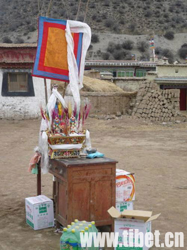 村子廣場中間擺放著切瑪和經幡旗。 攝影:曲曉麗