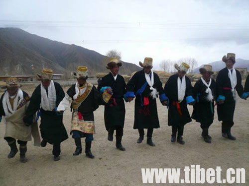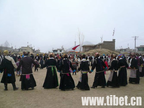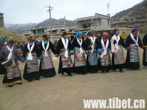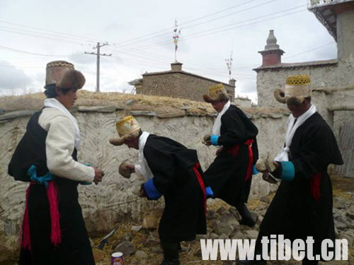 當每個人投擲三次之后,第一輪比賽就結束了。所有的人一陣歡呼,飛跑著來到牛角處撿拾自己心儀的石頭,準備繼續投入下一輪的戰斗。三輪比賽結束之后,四個村都有代表擊中牛角,這就預示著在新的一年中,所有的村落都會風調雨順,吉祥如意。村民們來到廣場邊,圍坐在一起,喝著青稞酒,聊著天,等候著一會兒將要進行的跳“鍋莊”活動。