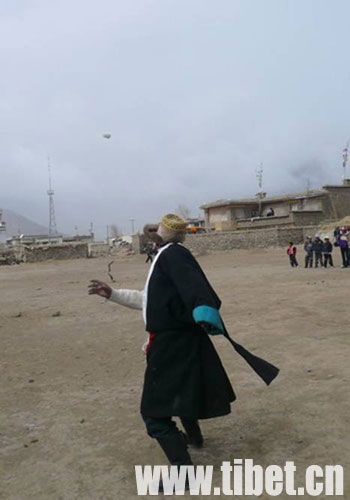 清晨的唐嘎村,陽光明媚,空氣新鮮,遠處的雪山在浮云的掩映下,亦真亦幻。村中的小廣場中間,早早地就擺好了切瑪、經幡、哈達和各種飲品。嬉戲的孩童們已經急不可待地拿早已樹立起來的牛角當靶子,躍躍欲試地扔石頭了。中午時分,家家戶戶都更換完了經幡,廣場上的人越來越多,一眼就能找到將要參加“石頭打牛角”活動的“勇士們”。他們腳踏皮靴,身披黑色藏胞,頭戴繪有藏式圖案的黃色藏帽,一眼望去,英勇颯爽之氣撲面而來。