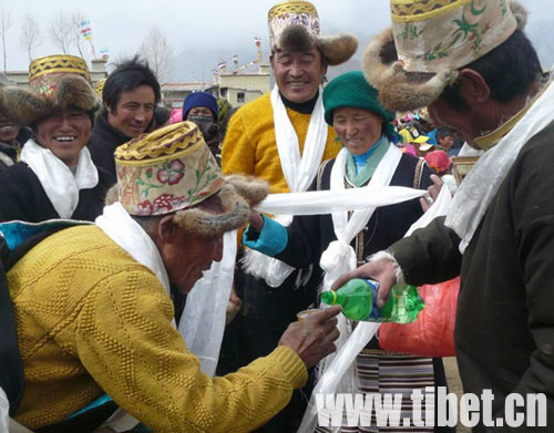 為打中牛角的勇士敬飲料,獻哈達,表示祝賀。 攝影:曲曉麗