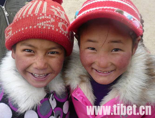 兩個藏族小姑娘在村中廣場玩耍。 攝影:曲曉麗