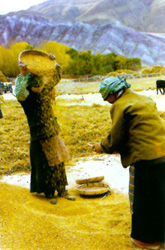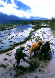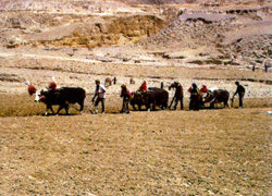 二牛抬杠的耕作方法一直沿襲到20世紀中葉,在一些偏僻鄉村至今也能偶爾見到這種古老的耕作方祛。在20世紀80年代以后,以手扶拖拉機為主的新型農業機械和農用動力普遍代替了傳統的牛力、人力。農業機械化、電氣化、化學化、水利化、良種化及精耕細作化水平逐漸提高,給西藏農業傳統注入了現代化活力。到1997年時,西藏農業機械總動力達77.45萬千瓦,農村用電量1929萬千瓦/小時,農用化肥施用折純量2.44萬噸,農田有效灌溉面積156.74千公頃,西藏農牧業發展基礎設施已得到較好的改善。1988年以來,農業連年獲得豐收,1997年糧食總產量達79萬噸,1998年達85萬噸。2001年,西藏糧食產量達98.25萬噸,連續奪得了14個豐收年,為1959年的5.5倍,再創歷史新高。2002年,全區農機化工程勢頭良好,全區機耕、機播、機收面積分別達11.6萬公頃、14.6萬公頃、8.4萬公頃,為西藏下一步的農業發展打下了良好的基礎。