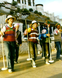 在西藏又苦又累的打夯場,你同時也可以看到載歌載舞的場面。藏族人喜歡快樂地勞動,有音樂、歌聲伴奏的勞動。邊歌邊舞邊勞動,是西藏獨特的勞動景觀。有些勞動過程甚至配有相應的勞動號子。如流傳于藏北民間的《達普號子》中唱到: