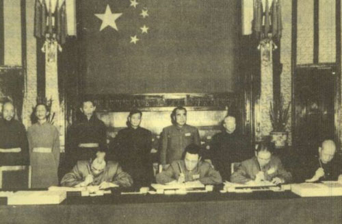 中央人民政府全權代表在關于和平解放西藏辦法的協議上簽字。前排右起:李維漢、張經武、張國華、孫志遠。