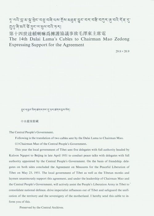 十四世達賴喇嘛擁護“17條協議”致毛主席的電報