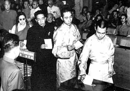 第一次全國人民代表大會上,十四世達賴喇嘛(右)和十世班禪(右二)在投票
