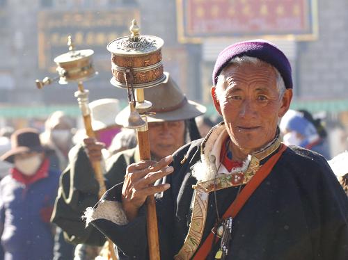 資料圖片:藏族信教群眾手持轉經筒轉八廓街(2007年11月拍攝)。新華社記者 索朗羅布 攝