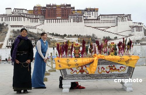 在二十三日的布達(dá)拉宮廣場,不時有市民、游客在切瑪前照相。據(jù)布達(dá)拉宮管理處負(fù)責(zé)人介紹,往年藏歷新年期間,多以鮮花裝點(diǎn)布達(dá)拉宮廣場,今年為突出民族特色,特地在廣場擺放了象征五谷豐登、來年身體康健的切瑪。