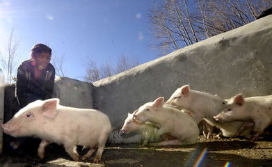 資料圖片:西藏山南地區乃東縣克松村的村民卓嘎在喂豬(2008年12月15日攝)。新華社記者 普布扎西攝