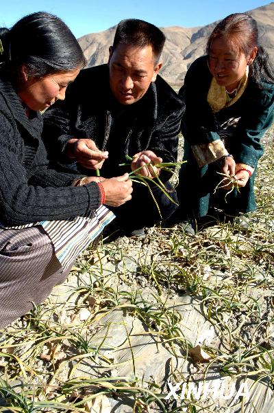 資料圖片:2006年12月5日,西藏乃東縣的兩位農民在種藏蒜能手嘎多次仁(中)的指導下學習大蒜種植經驗。新華社記者 索朗羅布 攝