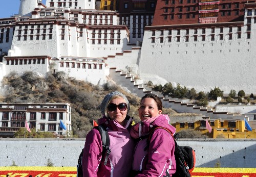 資料圖片:4月5日,兩名來自德國的游客在拉薩布達(dá)拉宮前合影。 新華社記者 覺果 攝