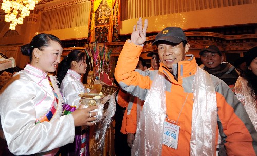 資料圖片:4月11日,藏族姑娘為來自珠海、澳門的游客敬獻(xiàn)青稞酒。新華社記者 格桑達(dá)瓦 攝