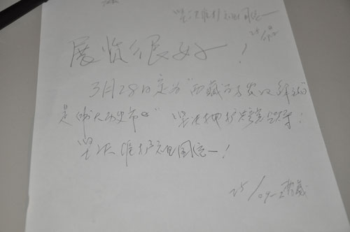 記者在展廳入口看到,兩本二百多頁的留言簿上,寫滿了來自全國各地的觀眾的留言。安徽省一位援藏干部說,展覽真實地反映了西藏的面貌,漢族和藏族都是偉大的民族,都是祖國五十六個民族中的優(yōu)秀成員,團結(jié)進步是我們共同的責任和義務。