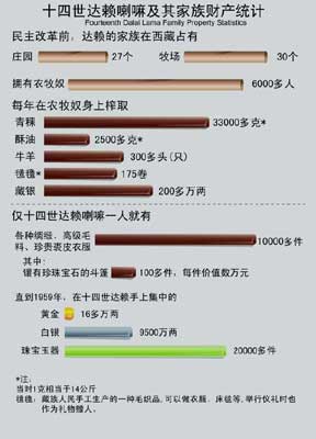 民主改革前,十四世達(dá)賴家族在西藏占有27座莊園、30個(gè)牧場(chǎng),擁有農(nóng)奴6000多人。每年在農(nóng)奴身上榨取青稞33000多克(1克相當(dāng)于14公斤)、酥油2500多克、藏銀200多萬(wàn)兩、牛羊300頭、氆氌175卷。1959年,十四世達(dá)賴?yán)锉救耸稚嫌悬S金16萬(wàn)兩、白銀9500萬(wàn)兩、珠寶玉器2萬(wàn)多件,有各種綢緞、珍貴裘皮衣服1萬(wàn)多件,其中價(jià)值數(shù)萬(wàn)元的鑲有珍珠寶石的斗篷100多件。作為舊西藏最大的農(nóng)奴主十四世達(dá)賴的累累罪惡罄竹難書(shū)——