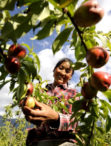 資料圖片:西藏林芝地區(qū)的一名藏族姑娘在采摘水果(2008年7月9日攝)。新華社記者 普布扎西 攝