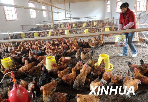 資料圖片:西藏林芝地區(qū)林芝縣唐堆村養(yǎng)雞場的管理員周華英正在喂雞(2008年10月28日攝)。新華社記者 索朗羅布 攝