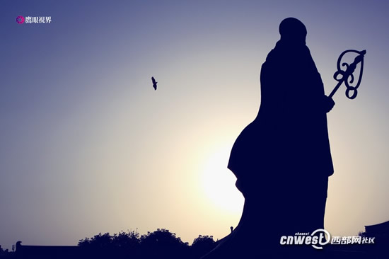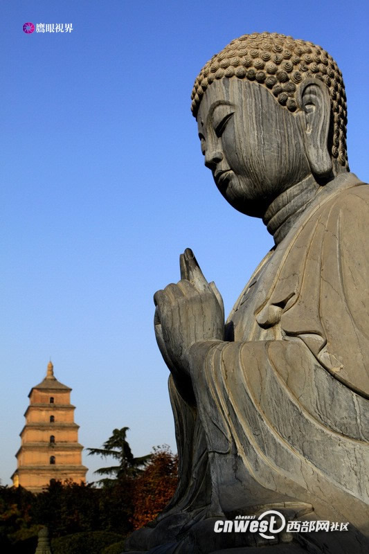 大雁塔是樓閣式磚塔,高64.517米,底層邊長25米,塔身呈方形角錐體,坐落在底面積42.5×48.5米,高4.2米的方形磚臺上,青磚砌成的塔身磨磚對縫,結構嚴整,外部由仿木結構形成開間,大小由下而上按比例遞減,塔內有螺旋木梯可盤登而上。每層的四面各有一個拱券門洞,可以憑欄遠眺。整個建筑氣魄宏大,格調莊嚴古樸,造型簡潔穩重,比例協調適度,是唐代建筑藝術的杰作。(網友:雄鷹在藍天 更多圖片>>)