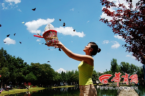 在傳統的大型慶典活動中,人們喜歡放飛鴿子來營造祥和的氣氛。然而最近幾年,來自楊凌博覽園的蝴蝶卻成了很多慶典活動上放飛的新寵。