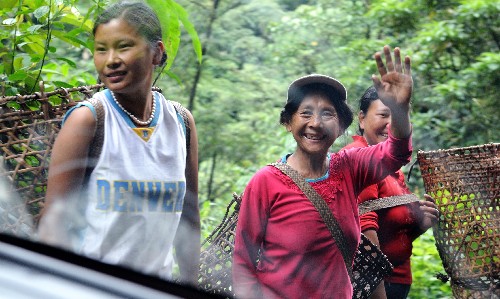 墨脫縣的門巴族群眾友好地和游客打招呼(7月10日攝)。 新華社記者 格桑達瓦 攝