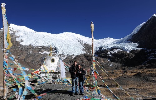 1月14日,兩位外國游客在西藏卡若拉冰川前合影。 卡若拉冰川位于西藏浪卡子縣和江孜縣交界處,冰舌前沿海拔5560米,巨大的冰川從山頂一直延伸至路邊,寒氣迫人,游人觸手可及。 新華社記者 金良快 攝