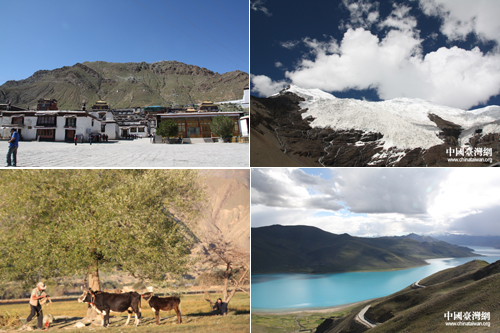 左圖二放牛的牧民,右圖二為羊卓雍湖。(中國臺灣網 李典典攝)