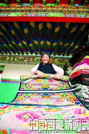 資料圖片:圖為日喀則地區江孜縣江孜鎮江嘎村的邊倉老阿媽在自家寬敞明亮的藏式新房里鋪卡墊,布置美好新生活(資料圖片)。 旦增 攝(圖片來源:《西藏日報》)
