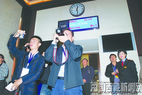 青藏鐵路成為采訪團最為感興趣的話題之一,8月31日12時左右,拉薩火車站客運運轉部工作人員接待了采訪團,介紹了拉薩火車站的運轉情況。據悉,拉薩火車站今年已發送旅客人數57萬人次。12時53分,正當采訪團準備離開之際,一聲汽笛從遠方傳來,西寧開往拉薩的臨時客運列車緩緩駛進了拉薩火車站,工作人員告訴采訪團,隨著今年暑運高峰期過去,臨客已完成今年使命,采訪團用鏡頭記錄下了這特殊時刻。
