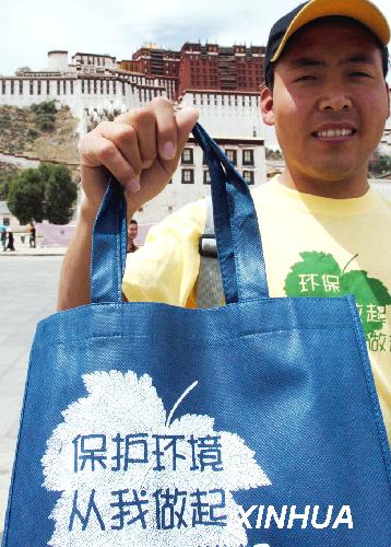 資料圖片:2004年6月12日,拉薩環(huán)保“布袋行動”志愿者貢覺在布達拉宮前展示環(huán)保布袋。新華社發(fā)